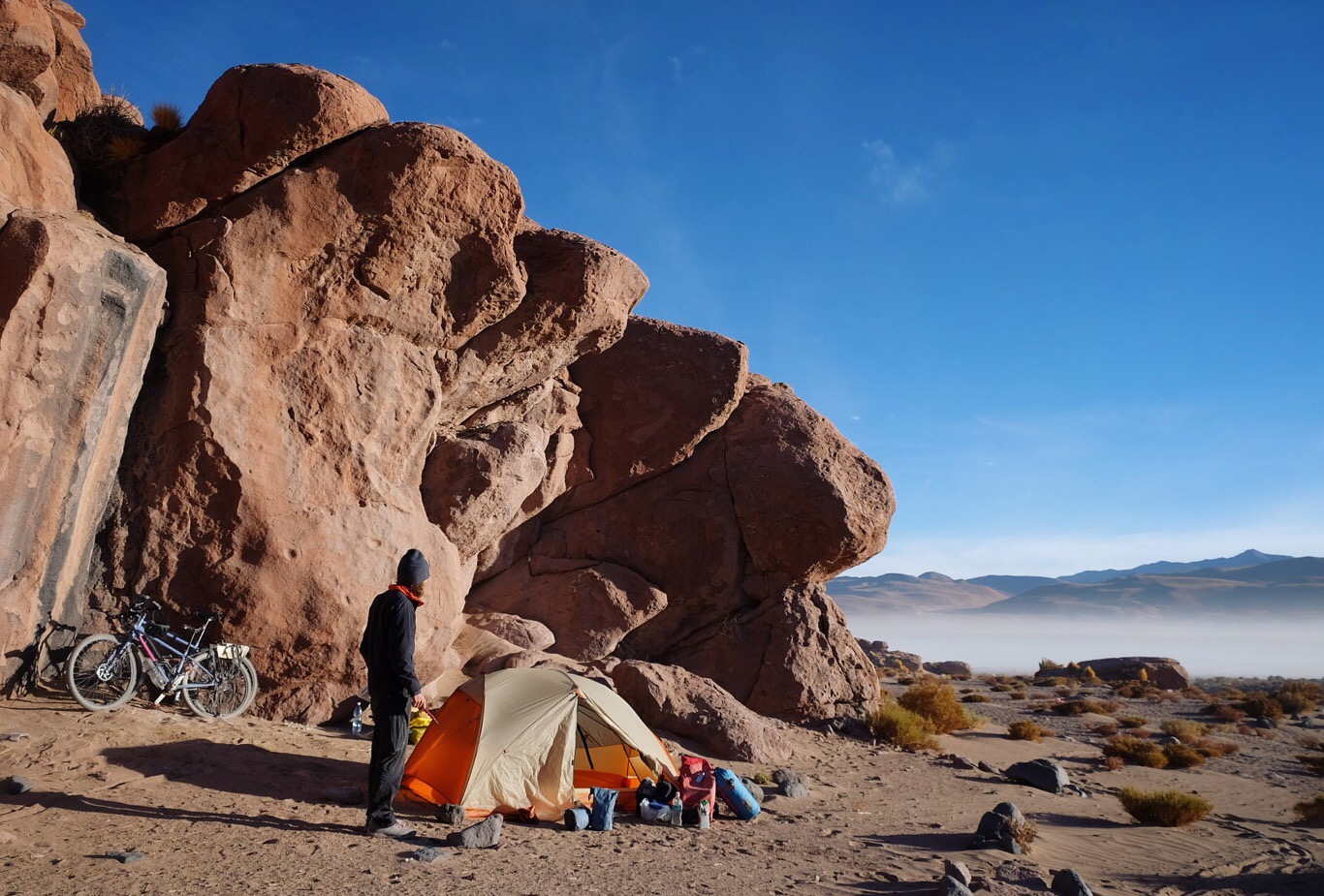 The landscape is vast, with brilliant blue skies and shimmering gold grasses framing perfect volcanic peaks. It’s a worthy setting for a futile battle with the elements. The wind indeed picks up, right on cue, and the relentless blasting is exhausting. I suggest, advise, then plead that we pitch the tent in one of the vaguely protected roadside ditches which are beginning to look rather delightful to me, but apparently still underwhelming to Andy. A crappy campspot in a beautiful area always feels like a failure. He coaxes another stretch of pedalling out of me, and we’re rewarded with a spectacular spot and moderate shelter. Not before a short hike a bike through some vicious looking plant life to get there, naturally. Thankfully the tyres hold their own, though the leg skin doesn’t fare quite as well.