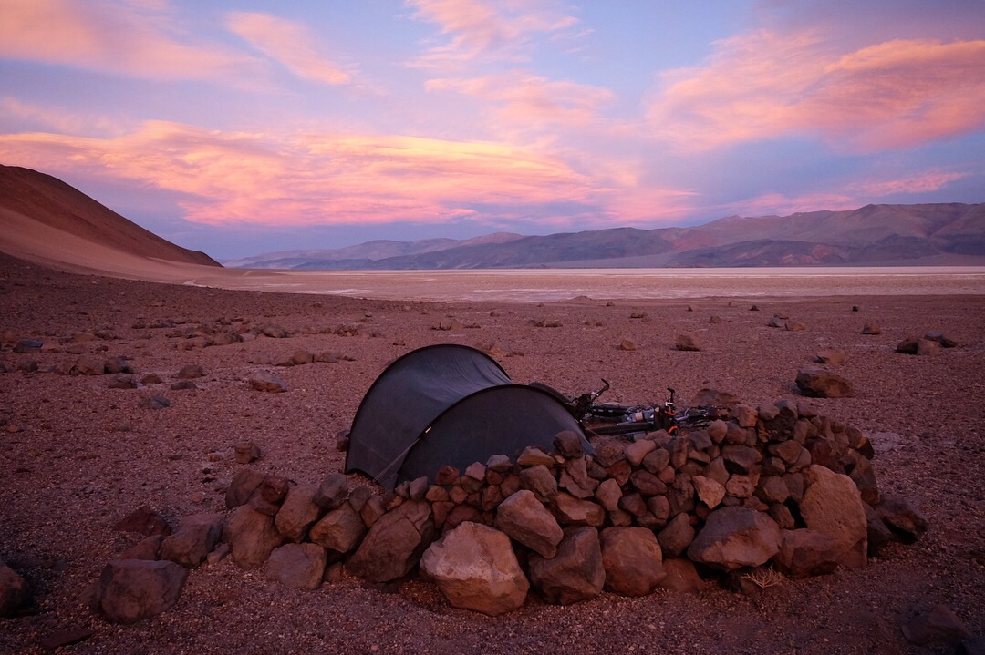 Not much shelter south of Antofalla. We built a rock wall after getting hit by some crazy headwinds, it’s on the right in an area strewn with rocks at km 179 / 22km south of Antofalla / 25.666501 S 67.724209 W