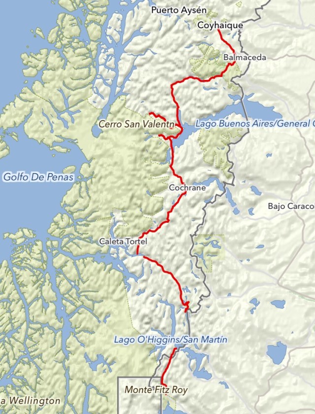 Coyhaique – Villa Cerro Castillo – Puerto Rio Tranquilo – Exploradores glacier detour – Lago Leones detour – Puerto Bertrand – X-890 detour – Cochrane – Caleta Yungay – Villa O’Higgins – El Chalten